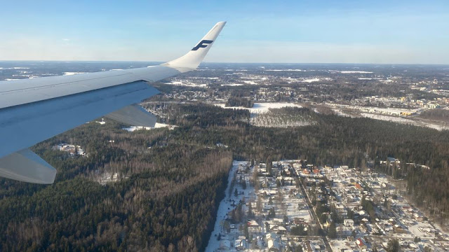Geflogen wurde mit einer kleinen Embraer 190, die auf zwei mal zwei Sitzreihen gerade mal 100 Personen fasst. Aber der Flug war ganz ruhig und nach einem kostenlosen Gläschen Wasser sahen wir auch schon die ersten schneebedeckten Inseln vor Finnland auftauchen. Weiter ging es dann entlang des Finnischen Meerbusens bis wir dann bei Sonnenschein und angenehmen 8° in Helsinki landeten.